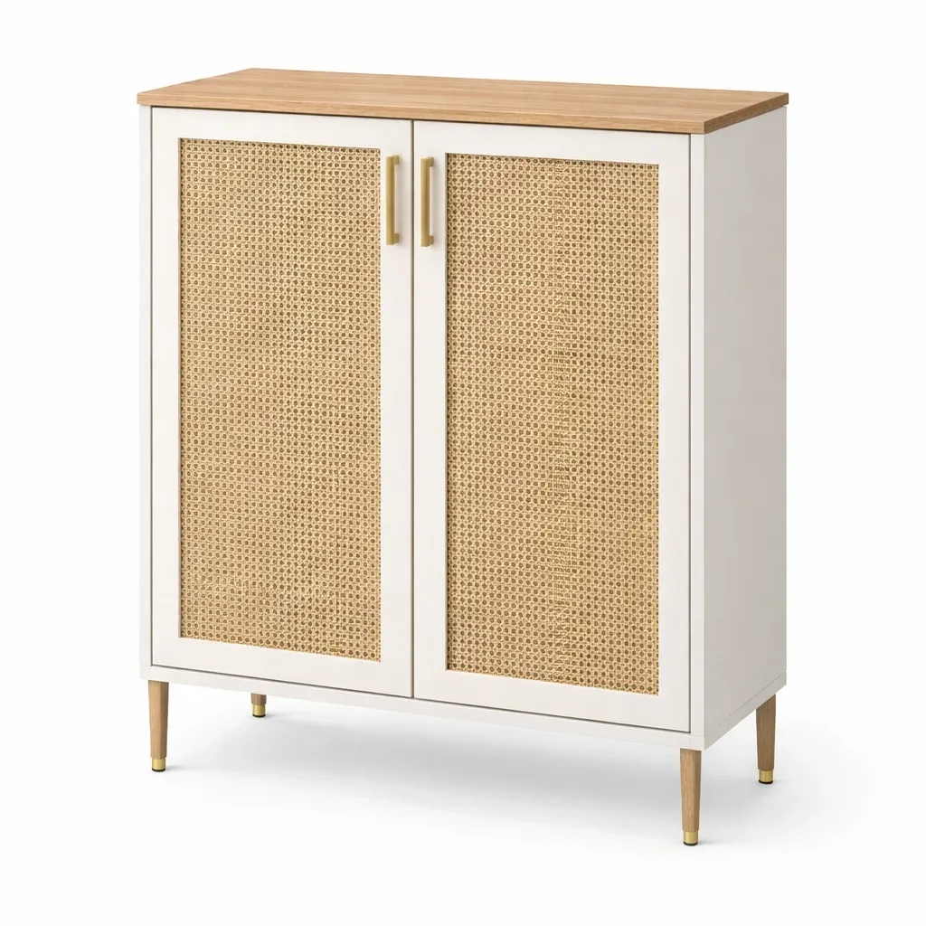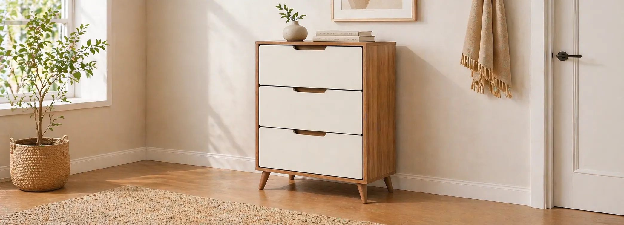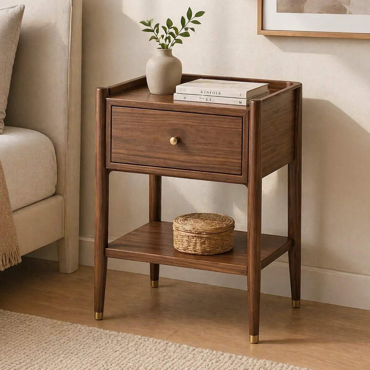 Eleganter Walnuss-Nachttisch mit einer Schublade und offenem Fach. Minimalistisches Mid-Century-Design mit klaren Linien und goldfarbenem Griff. Ideal für Schlafzimmer, praktisch für Bücher, Lampen oder Dekoration.